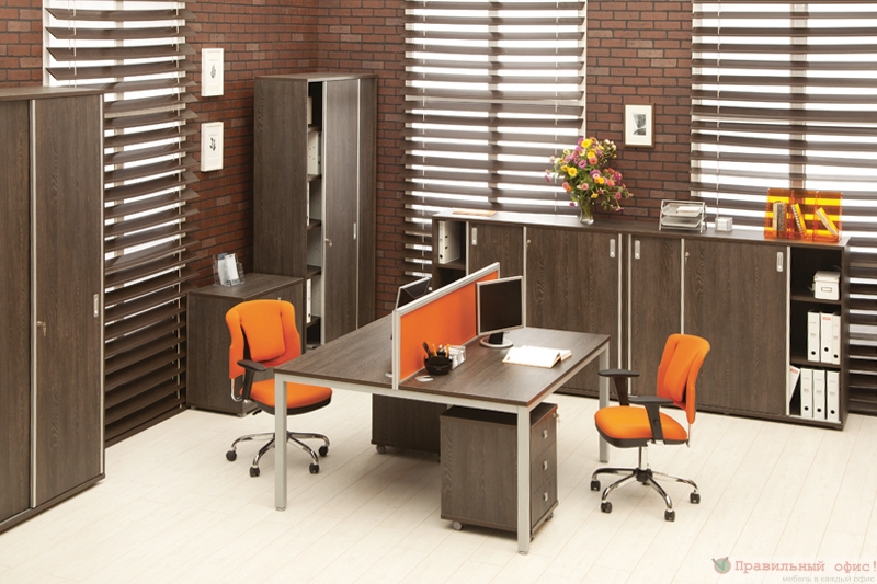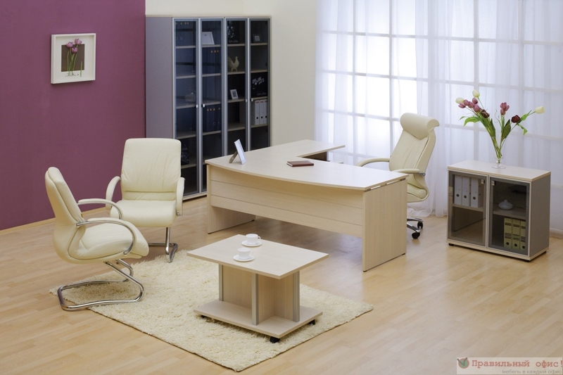 Столы, полностью выполненные из ЛДСП 25мм, и тумбы с оригинальными декоративными элементами придают всему офисному комплекту особый шарм и грациозную монументальность