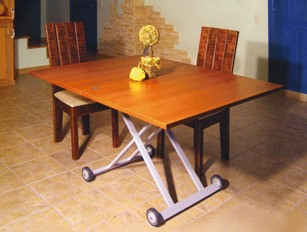 Представленный стол-трансформер изменяется по высоте от 170 до 740 мм и фиксируется в любой желаемой точке. Легкость и плавность регулировки высоты обеспечивает механизм трансформации немецкого производства, основанный на газовом лифте. Площадь стола-трансформера увеличивается в два раза от 1100×700 (сложен) до 1400×1100 (разложен). Металлические части изделия имеют порошковое полимерное покрытие Europolveri (Италия). Для деревянных ног применяется высокогорный дуб Краснодарского края. В конструкции стола-трансформера применены самосмазывающиеся подшипники скольжения на базе материала полиамид-6 с графитовым наполнением. При повороте столешница стола-трансформера скользит по специальному материалу содержащему Teflon. Колёсные опоры немецкого производства снабжены шинами из немаркой серой резины и защитными щёчками, препятствующими наматыванию на ось вращения ниток, волос и т.д.